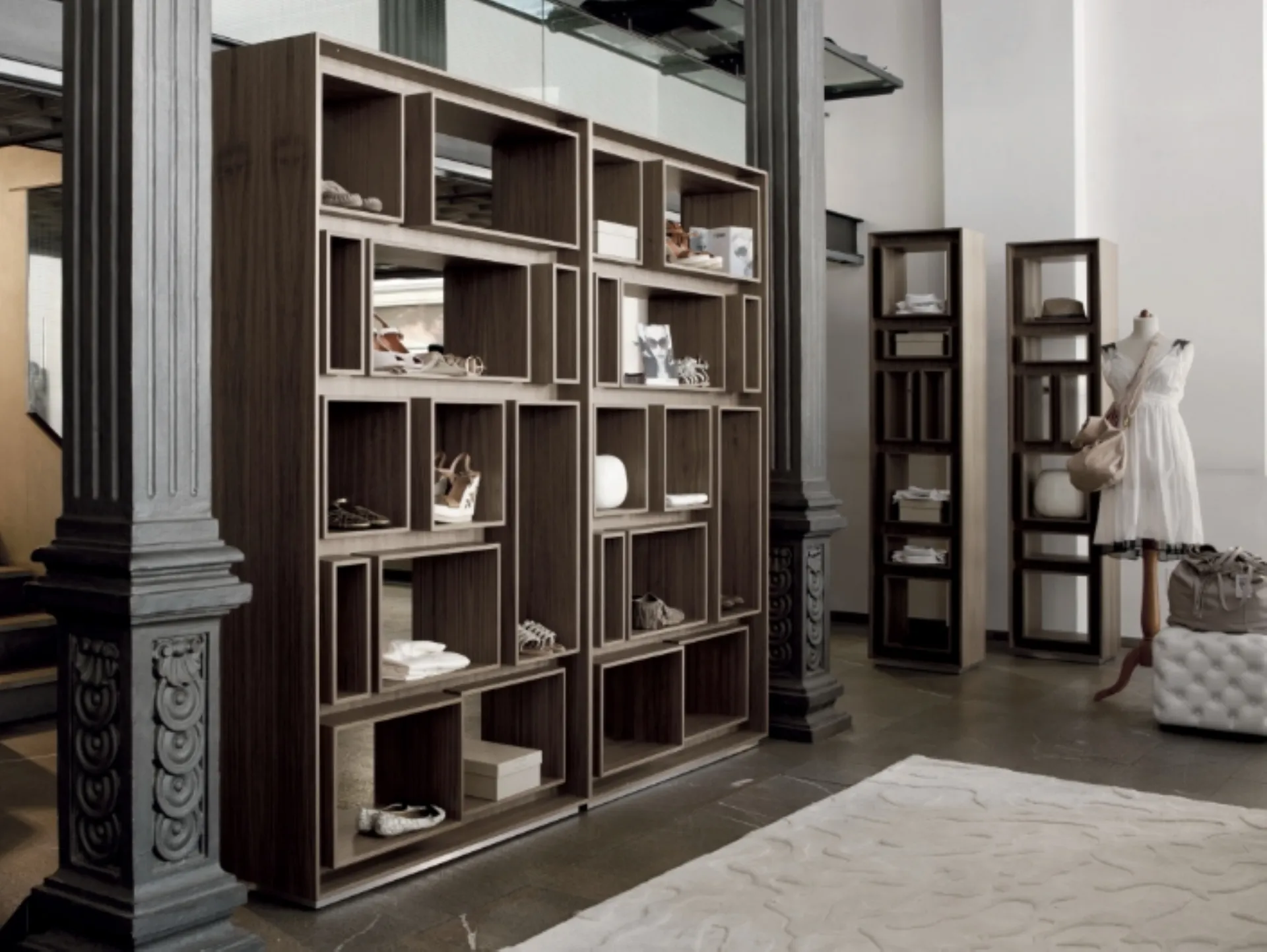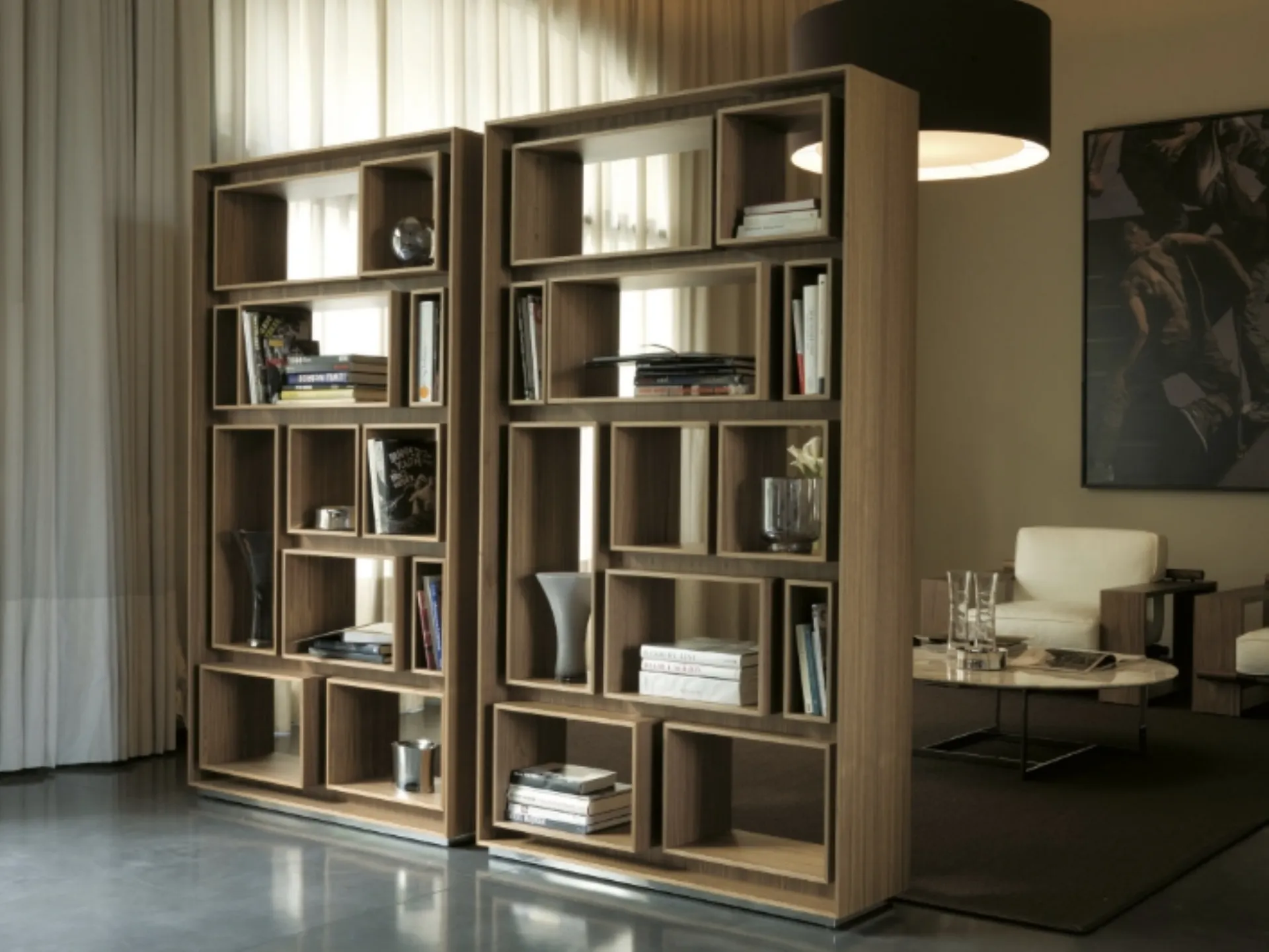 Contact us for information and quotes on the model visible in the photo: if you want to complete your design rooms, then this bookcase with its bold shapes is perfect for you. Design bookcases are always very appreciated for organizing the living space and walls, perfectly combining practicality and design. Porada partition bookcases are available in different forms: corner, linear, suspended, and customizable with various components, shelves, and compartments. The First partition bookcase by Porada in the photo, in the wood variant, is truly functional and versatile, solid and durable, as well as customizable according to the most specific housing needs.