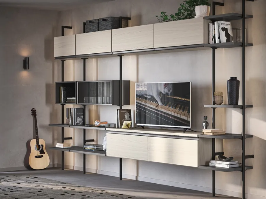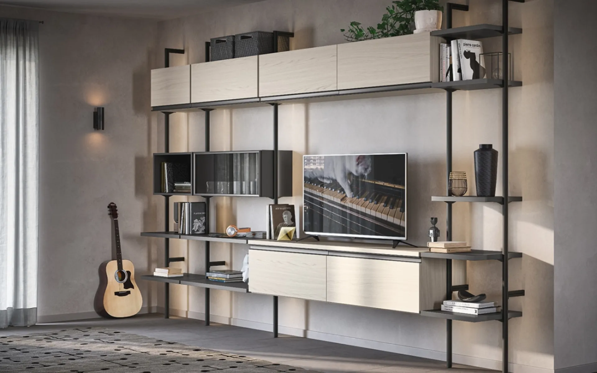 The modular bookcase Uniko by Cinquanta3, available here, fits perfectly in a practical and dynamic space that is also beautiful to look at. If you are looking for a living room furniture in melamine, which is sturdy, functional, pleasant, and elegant, take a look at our modern solutions to find the model that suits you. Adding value to your living space is possible: contact us for further information about the model of the living room furniture in the photo and optimize your home with the quality guaranteed by the well-known and renowned brand. Furniture for the living area, such as modular bookcases, allow you to keep the space organized by containing books, magazines, and various objects. Decorating the living room is easy: choose the best type of bookcase to equip the environment and enhance the look of the space.