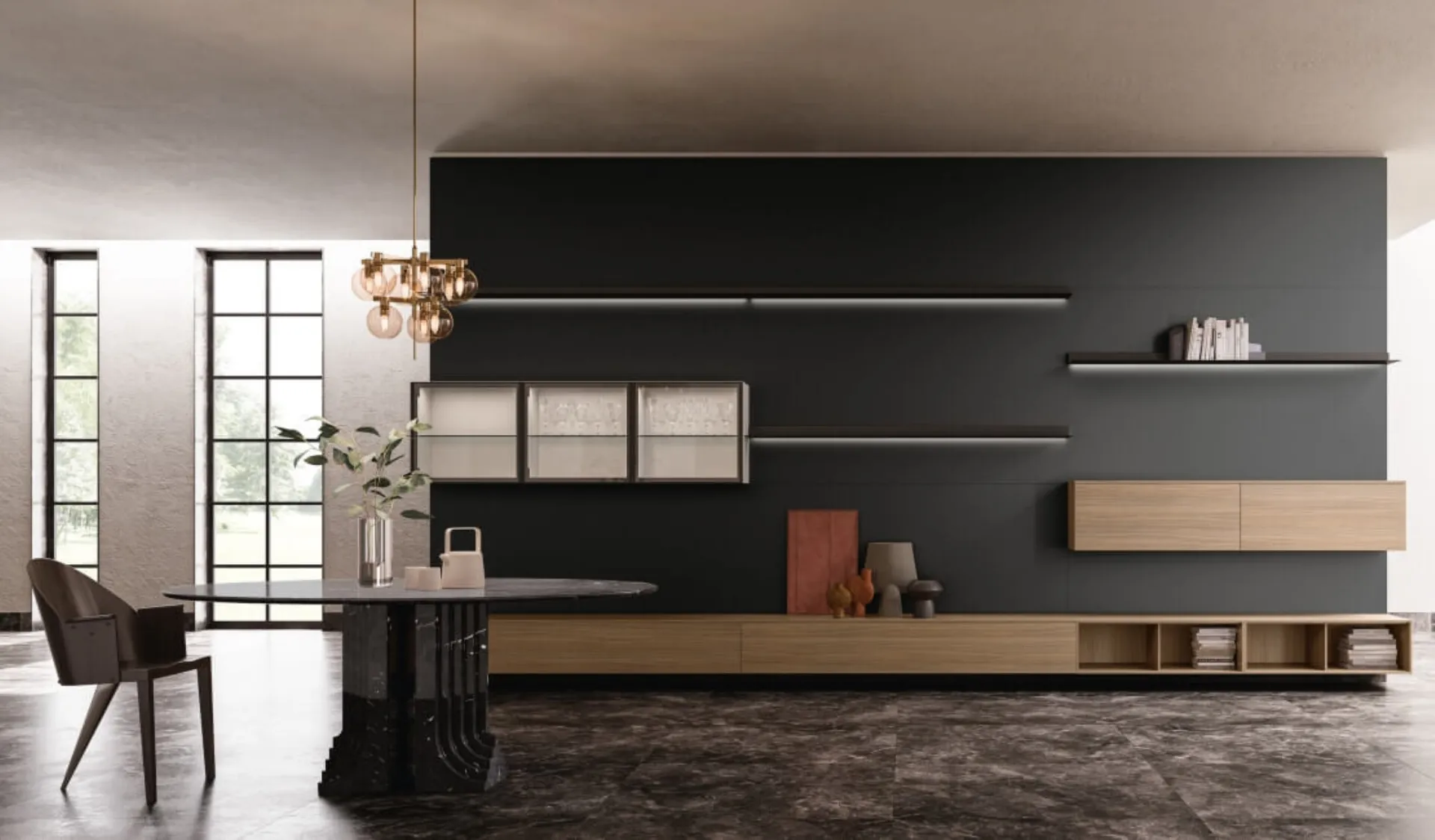 Through a dynamic game of combinations between open and closed compartments, modern Wall Units furnish the living room by making the most of every space. Wall Units have acquired a prominent place in the living area of our homes: they are multifunctional and space-saving furnishings that can always be custom-made. This wall unit is one of the solutions offered by the brand and will allow you to furnish the living room according to the most specific housing issues.